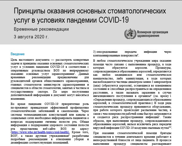Принципи надання основних стоматологічних послуг в умовах пандемії COVID-19. Тимчасові рекомендаціїwebudenta14 серп. 2020 р.Читати 1 хв Повний текст рекомендацій (варіант англійською мовою) Повний текст рекомендацій (варіант російською мовою)